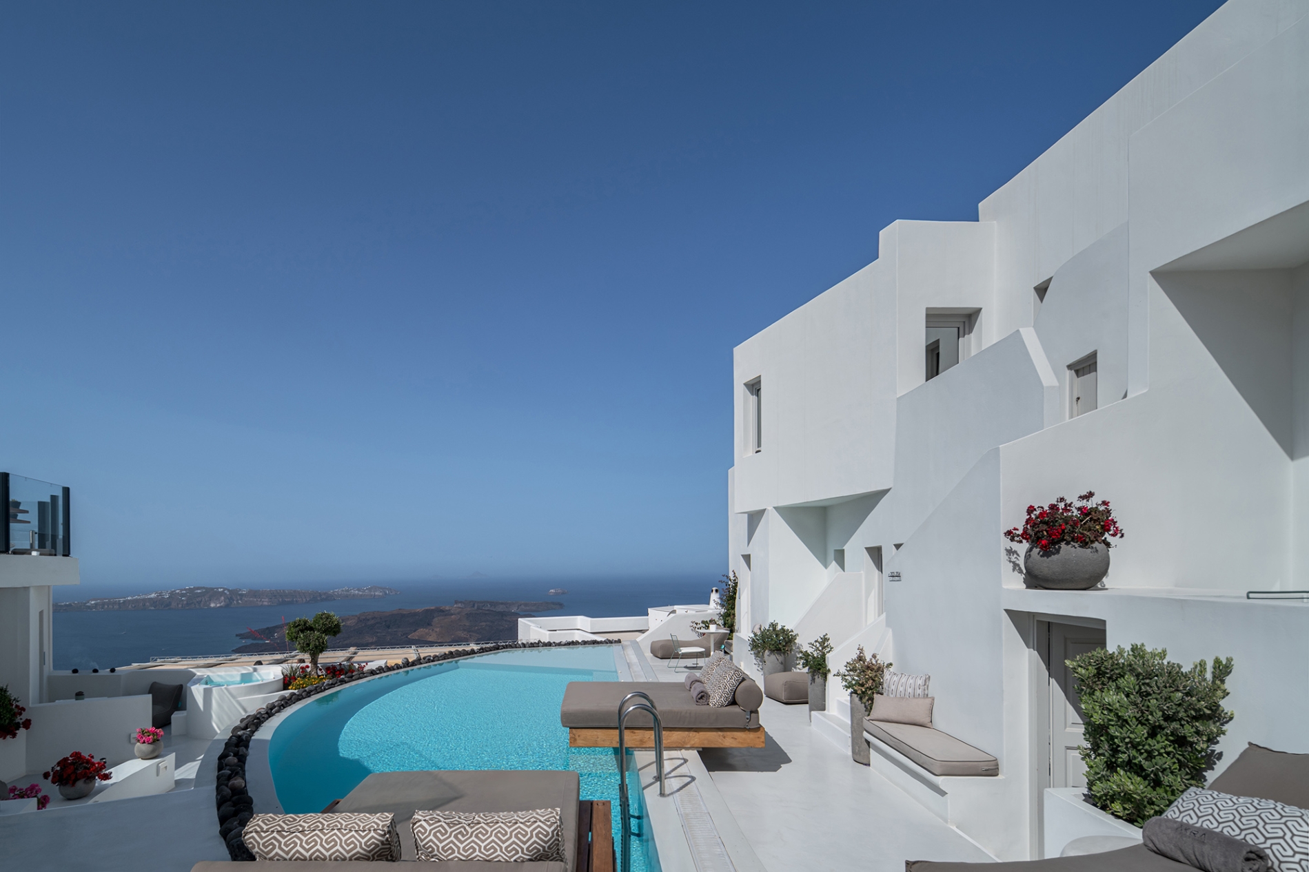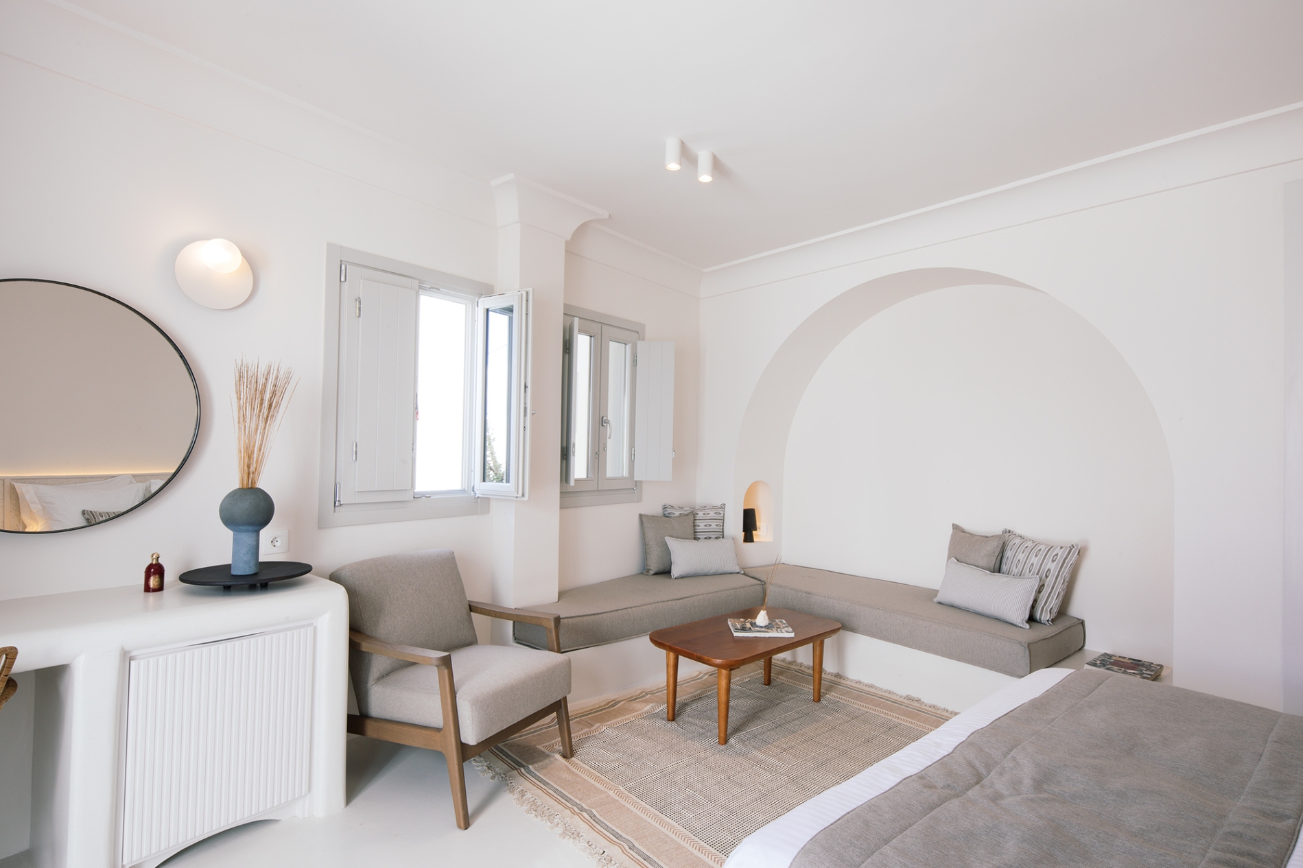 Inspired by the intriguing architecture of Santorini, the Superior Suite with Caldera View was made for comfort. Leisurely indulgence meets contemporary comfort and superb caldera views in an accommodation experience you'll instantly fall in love with. This irresistible suite is perfect for up to 3 adults, as it features a King Size bed, along with a dreamy terrace overlooking the caldera of Imerovigli, the sea, and of course, the majestic Santorinian sunset!
